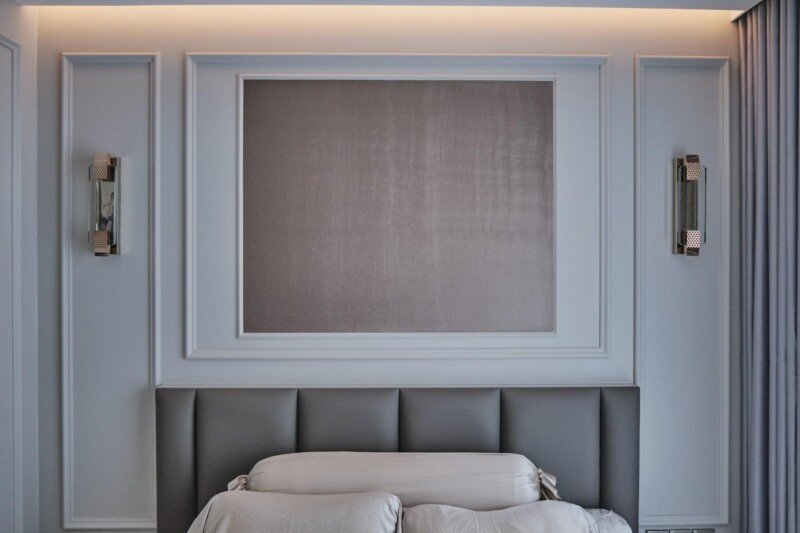 The master bedroom, much like the living room, portrays a cohesive neoclassical style. The elegant wall panelling creates a structured but yet elegant look. The continued use of neutral tones in addition to the recessed ambient lighting helps to soften the look of the whole room. The wall lamps on either side of the bed add a touch of modern luxury , complementing the whole aesthetics.