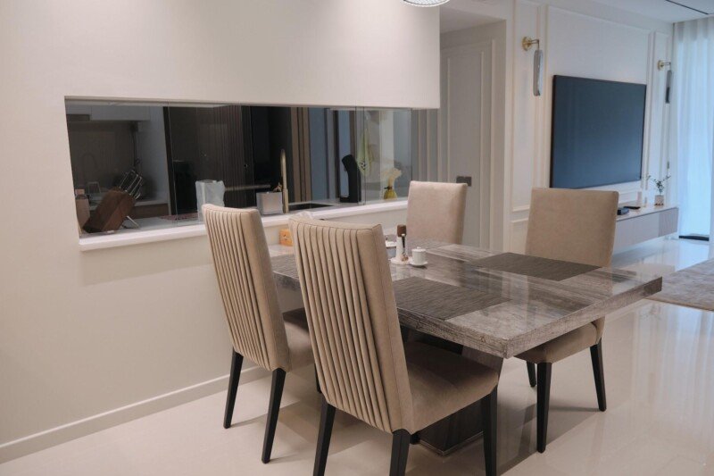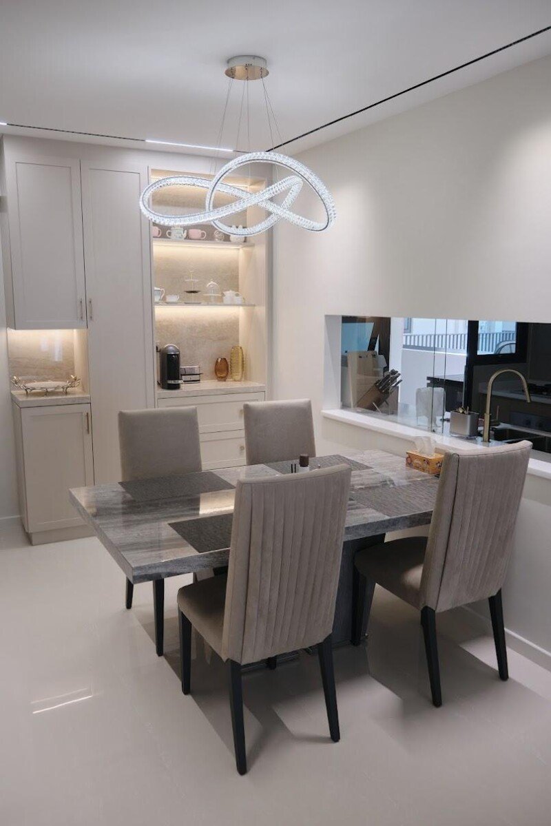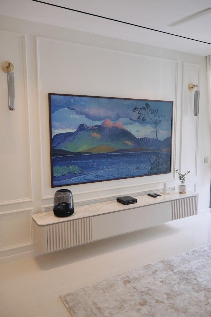 Our client’s neoclassical themed luxurious 4 bedder in the East embodies a blend of modern simplicity and understated elegance. The neutral colour palette creates a calming and spacious atmosphere. The feature wall’s angular panels add textures and depth to the otherwise flat surface. It also helps to conceal the wires, contributing to the uncluttered and sleek appearance. The curved suspended TV console aids in easier cleaning and housekeeping.