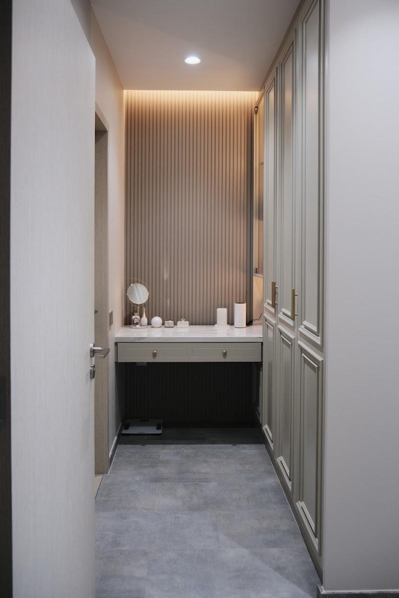 The wardrobe and vanity area continues to take on the same theme, with the classic paneling of wardrobe doors as well as gold hardware to add a touch of luxury. Though it is a narrow space, it is well utilised with open pigeonholes at the side of the vanity to provide more storage spaces. The fluted panels on the wall behind creates a stylish backdrop, enhanced by the singular recessed spotlight above.