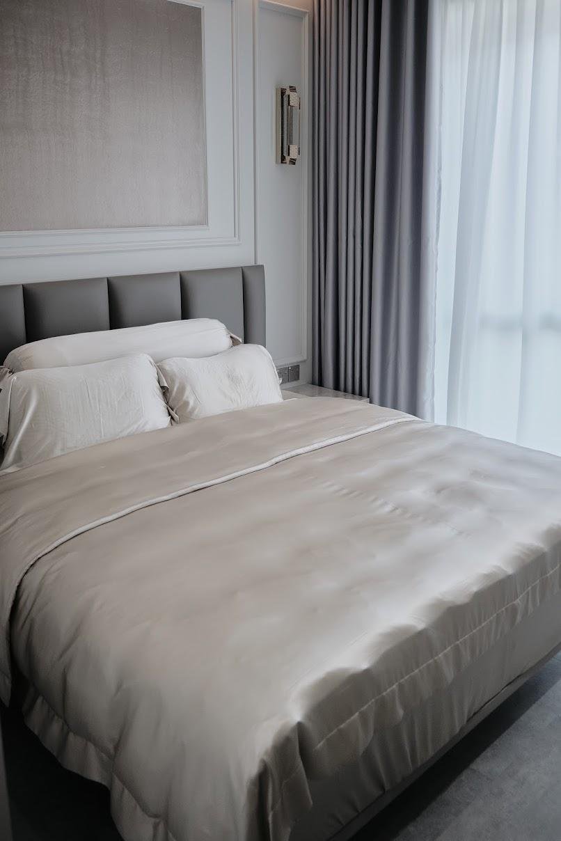 Our client’s neoclassical themed luxurious 4 bedder in the East embodies a blend of modern simplicity and understated elegance. The neutral colour palette creates a calming and spacious atmosphere. The feature wall’s angular panels add textures and depth to the otherwise flat surface. It also helps to conceal the wires, contributing to the uncluttered and sleek appearance. The curved suspended TV console aids in easier cleaning and housekeeping.